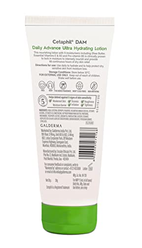 Cetaphil DAM Daily Advance Ultra Hydrating Lotion contains a unique combination of 5 key ingredients that protects dry skin and enhances hydration. It is clinically proven to provide 48 hours of skin comfort after a single application. It contains Shea Butter, Niacinamide, Panthenol, Glycerin and Sunflower Oil to instantly replenish, hydrate, and protect dry skin. Ideal for Continuously Dry, Sensitive Skin, Cetaphil DAM Daily Advance Ultra Hydrating Lotion is • Paraben-Free• Sulphate Free• Fragrance-Free• Hypoallergenic• Non Comedogenic: Won’t Clog Pores