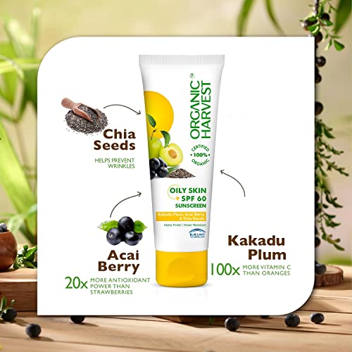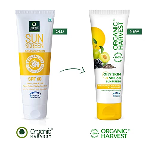 Organic Harvest Sunscreen SPF 60 For Oily Skin | For Women & Men with Blue Light Technology, Protects From Harmful UVA & UVB Rays | Quick Absorb, Hydrates Skin | 100% American Certified Organic, Sulphate & Paraben Free – 100gm